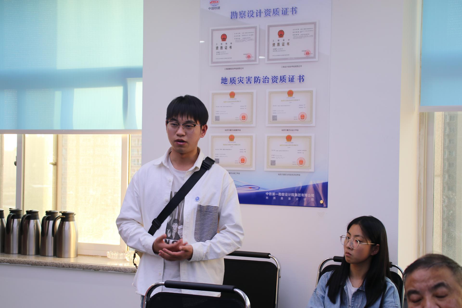 在座谈交流现场,铁一院地路院院长郭韫武首先对中国地质大学(武汉)工程学院师生们的到来表示热烈的欢迎,他从主要业务范围、在职员工、人才计划等方面讲解了铁一院地路院总体情况,并介绍了在院就职的地大校友整体情况。他表示,校企合作能够让学生将在校所学与企业实践有机结合,希望能够进一步加强校企合作交流,培养优秀人才。张文忠对地大学子表示了赞赏,简要介绍了地路院的人才需求情况,他勉励同学们踏实学习,重视实践,实现个人的全面发展。