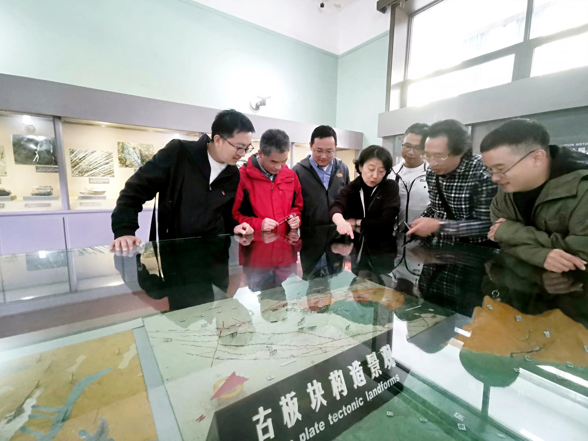 最后,大家参观了博物馆内的庐山世界地质公园展厅。地质出身的老师们针对庐山地区的断块山构造和变质核杂岩构造开展了深入的讨论。受构造运动作用,庐山孤山屹立,大构造巍峨壮观,小构造千姿百态,形成了“横看成岭侧成峰,远近高低各不同”的奇观。此外,大家还一起讨论了庐山神奇的冰蚀地貌。在庐山共发现一百余处重要冰川地质遗迹,完整地记录了冰雪堆积、冰川形成、冰川运动、侵蚀岩体、搬运岩石、沉积泥砾的全过程,是中国东部古气候变化和地质特征的历史记录。